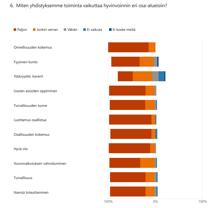 Hyvinvointi on hyvin henkilökohtainen kokemus. Erityisesti tukea tarvitsevien ihmisten kohdalla hyvinvointiin liittyvien kokemuksien arviointia vaikeuttavat käsitteelliset ja vuorovaikutukselliset haasteet, jolloin on oleellista saada läheisten näkökulma hyvinvointiin. Hyvinvoinnin arvioinnissa korostuu subjektiivisuus. Kysymyksen asettelu ei erottele harrastajia läheisistä vaan pyytää yleisarviota. Kyselyn mukaan yhdistyksen toiminta vaikuttaa positiivisesti kaikkiin hyvinvoinnin osa-alueisiin.